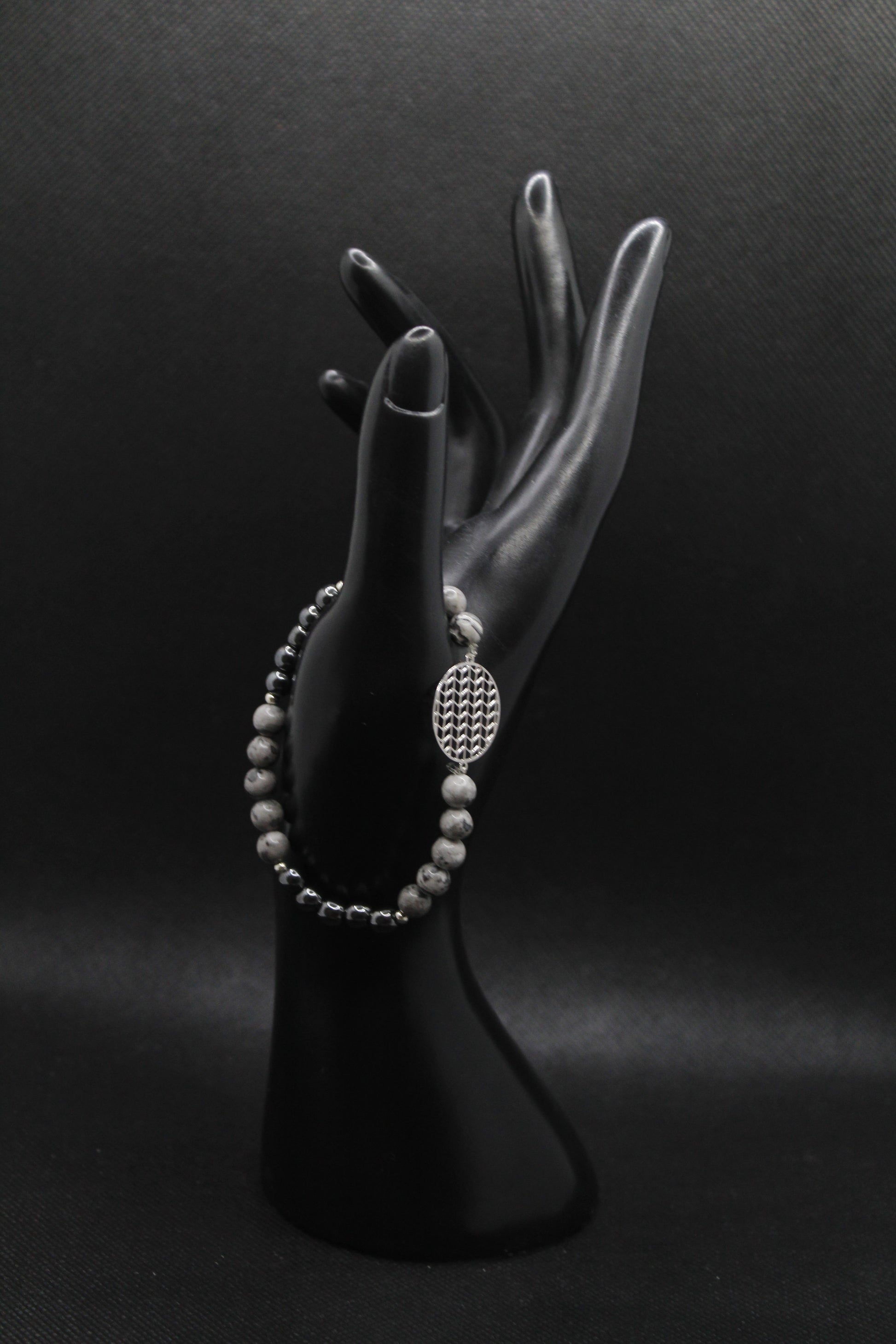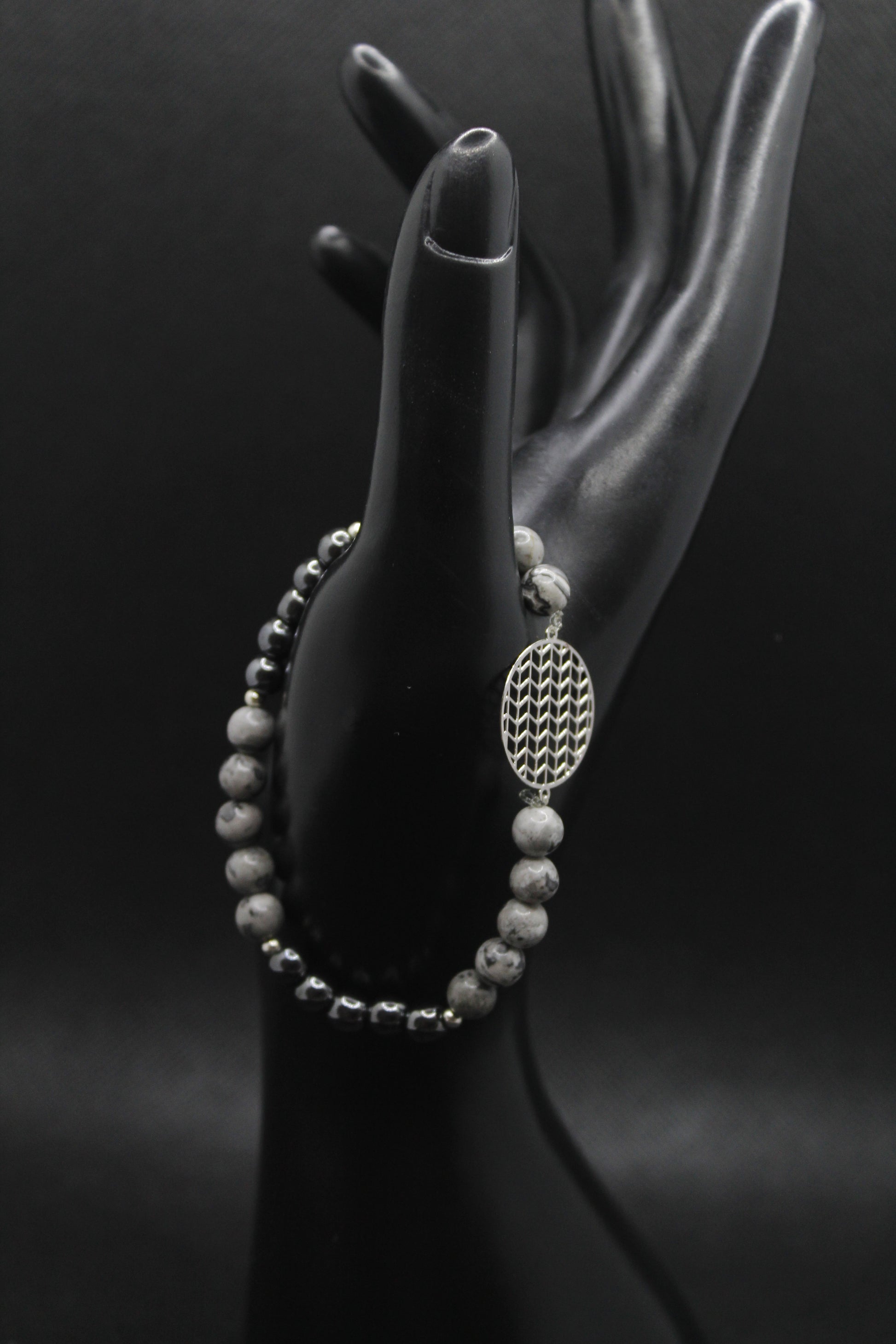 6cm de diamètre (élastique) - diamètre des perles 0.8cm (jaspe picasso) 0.6cm (hématite)